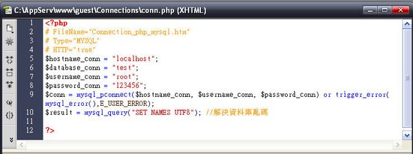 這是因為網頁編碼與MySQL的編碼不同,所以可以在網站內的 Connections 資料夾內有一個檔案,請在最後一行的 ?> 上面加上一行。