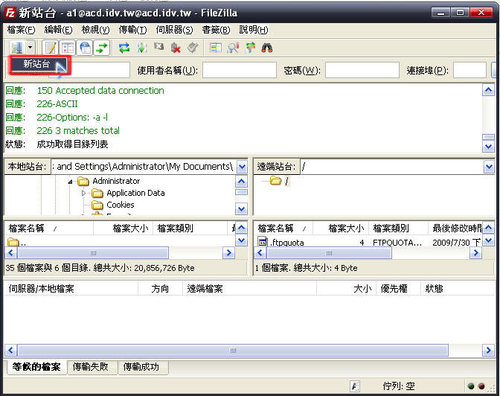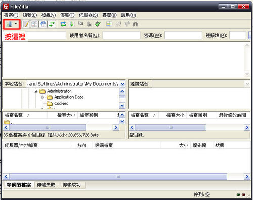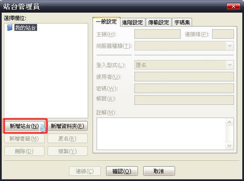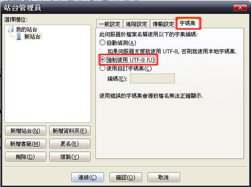 6.以後要連線,只要按左上角按鈕→新站台,就可以連線,而且中文不會亂碼。