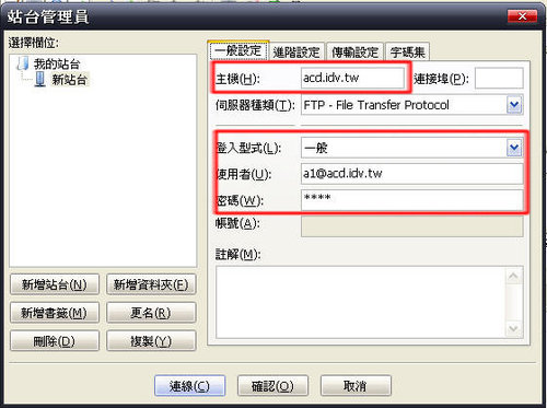 4.設定主機、登入型式、使用者(帳號)、密碼