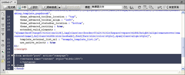 8.到Dreamweaver,貼到</head>的上面,並把下圖反白部份刪除,這是表單的文字區域語法。